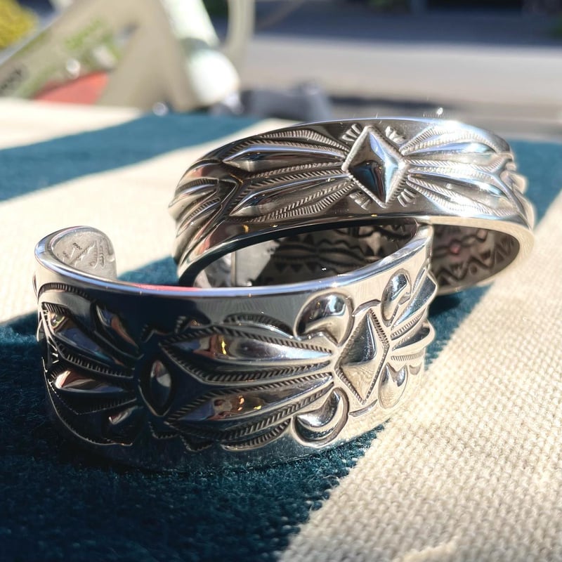 | 商品の特徴 | レイアダカイバングル2点セット レイアダカイ バングル。レイアダカイバングル2点セット レイアダカイ バングル。Ray Adakai ナバホ族 レイアダカイ バングル ダブルスタンプ。レイアダカイ バングル2点セットです。2025年最新】レイアダカイの人気アイテム - メルカリ。大…ダブルスタンプ、名前刻印無、内側直径6.5、開口3小…シングルスタンプ、名前刻印有、内側直径6.3、開口部2.9バラ売り希望はコメントください。。 | ||