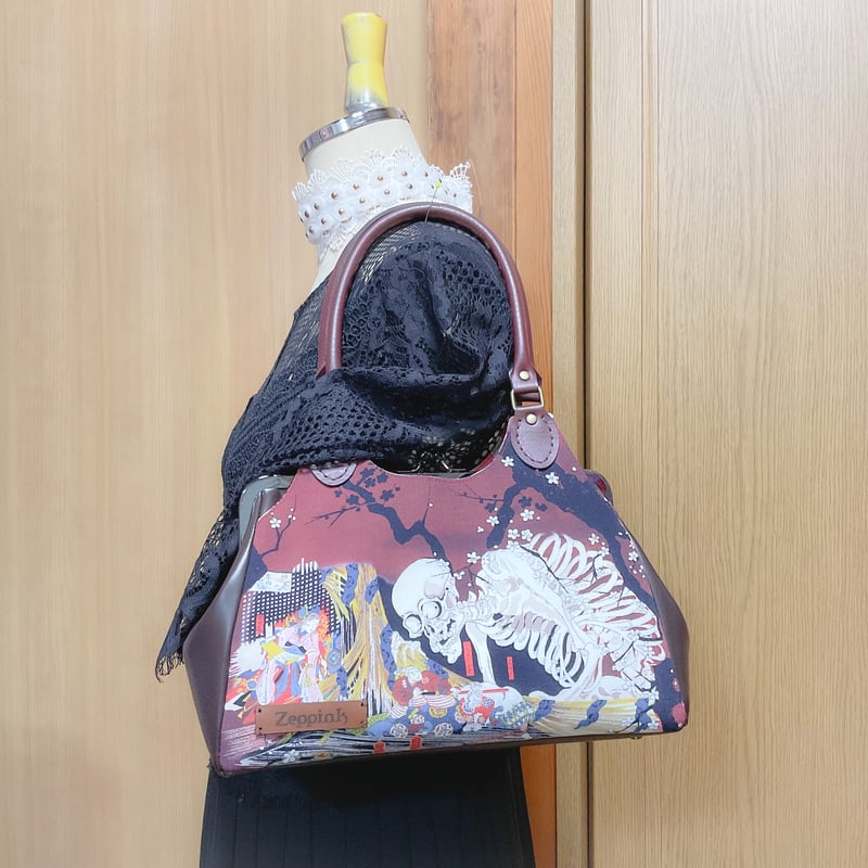 | 商品の特徴 | がしゃどくろ(えんじ)がま口バッグ | Zeppink。fit=scale-down,w=1200。☆24cm版、お散歩あおりがま口バッグの新柄紹介。がしゃどくろ。がしゃどくろ(えんじ)がま口バッグ | Zeppink。がま口バッグサイズ横 約 30.5cm (最大) 約 21cm (底部分)縦 約 21cm 強 (つまみ含まず) 約 22.5cm (あおり部分)マチ 約 9cm口金 20cm アンティークゴールド 角型 縫い付けタイプあおりポケット マチ部分 ・スカル柄生地あおりポケット 裏布 ・ツイル生地 黒がま口本体 ・ オックス生地 黒底部分 ・合皮 黒内布 ・テトロン 黒内ポケット 1個持ち手 ・スカル柄生地 約 40cm がま口本体にハードの布製の接着芯地を使っておりますあおりポケットとマチ部分にもしっかりタイプの接着芯と補強に厚地の布を貼ってあります底板入れてあります縫い目に少しズレがあるところがありますラウンドファスナー長財布・サイズ 横 約 20cm 縦 約 10cm マチ 約 2.5cm ・財布表地 スカル ドクロ柄・内布 オックス生地 黒・ポケット間仕切り・ガードポケット 12個 ・ファスナー付き小銭入れ スカル ドクロ柄 こちらもバッグ同様裏側にしっかりとした厚手の生地としっかりタイプの接着芯を貼ってありますファスナー部分に少し歪みがありますショルダーストラップ・オックス生地 黒 長さ調節可能手縫いの箇所もある為糸が見える所があるかもしれません価格 バッグ4650円長財布 3800円ショルダーストラップ 550円素人のハンドメイドですので、歪み、ほつれ、糸の見える部分など御座います。 | ||